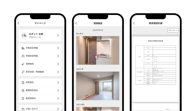 契約書類や送金明細、原状回復や清掃報告などかさばる書類もアプリで確認。ペーパーレスでスマートな賃貸管理を実現します。
